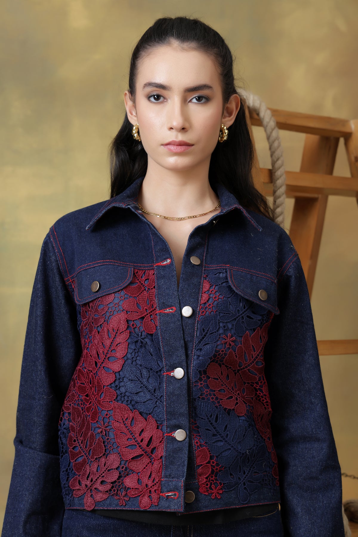 Crafted in cotton denim, overlaid with luxe guipure lace Dark denim base with blue and burgundy accents Jacket collar with front metal button closure Full sleeves with buttoned cuffs Luxurious burgundy thread highlights Front open silhouette for effortless layering e