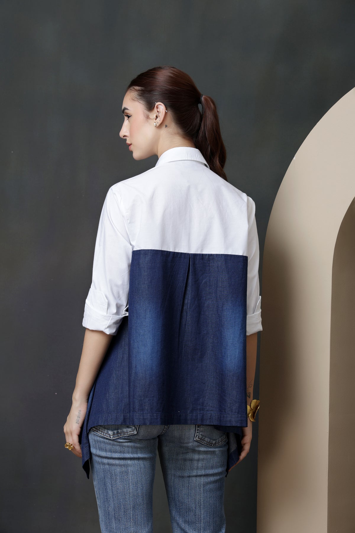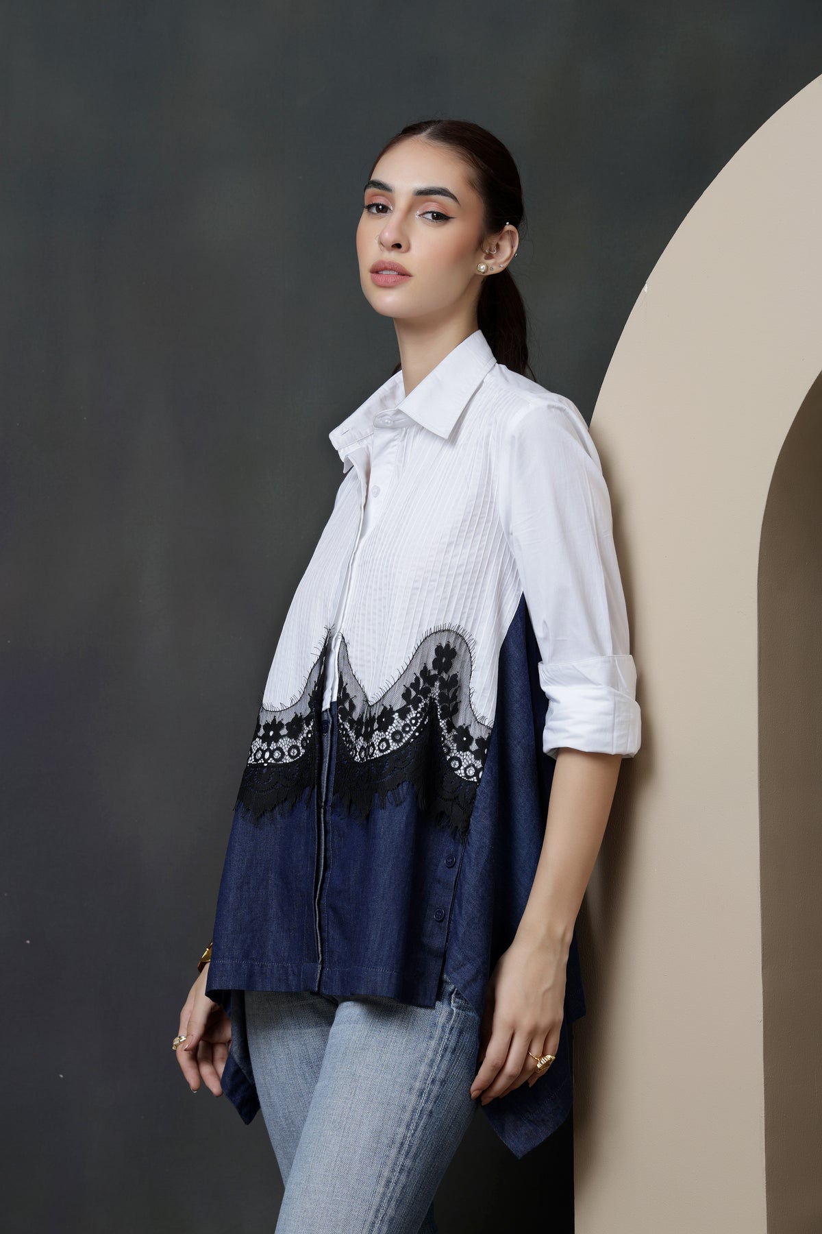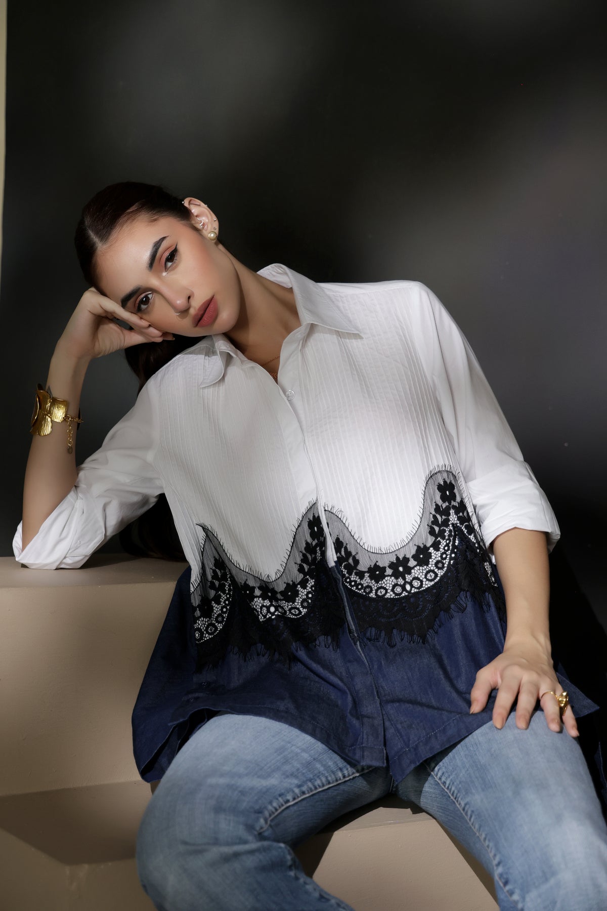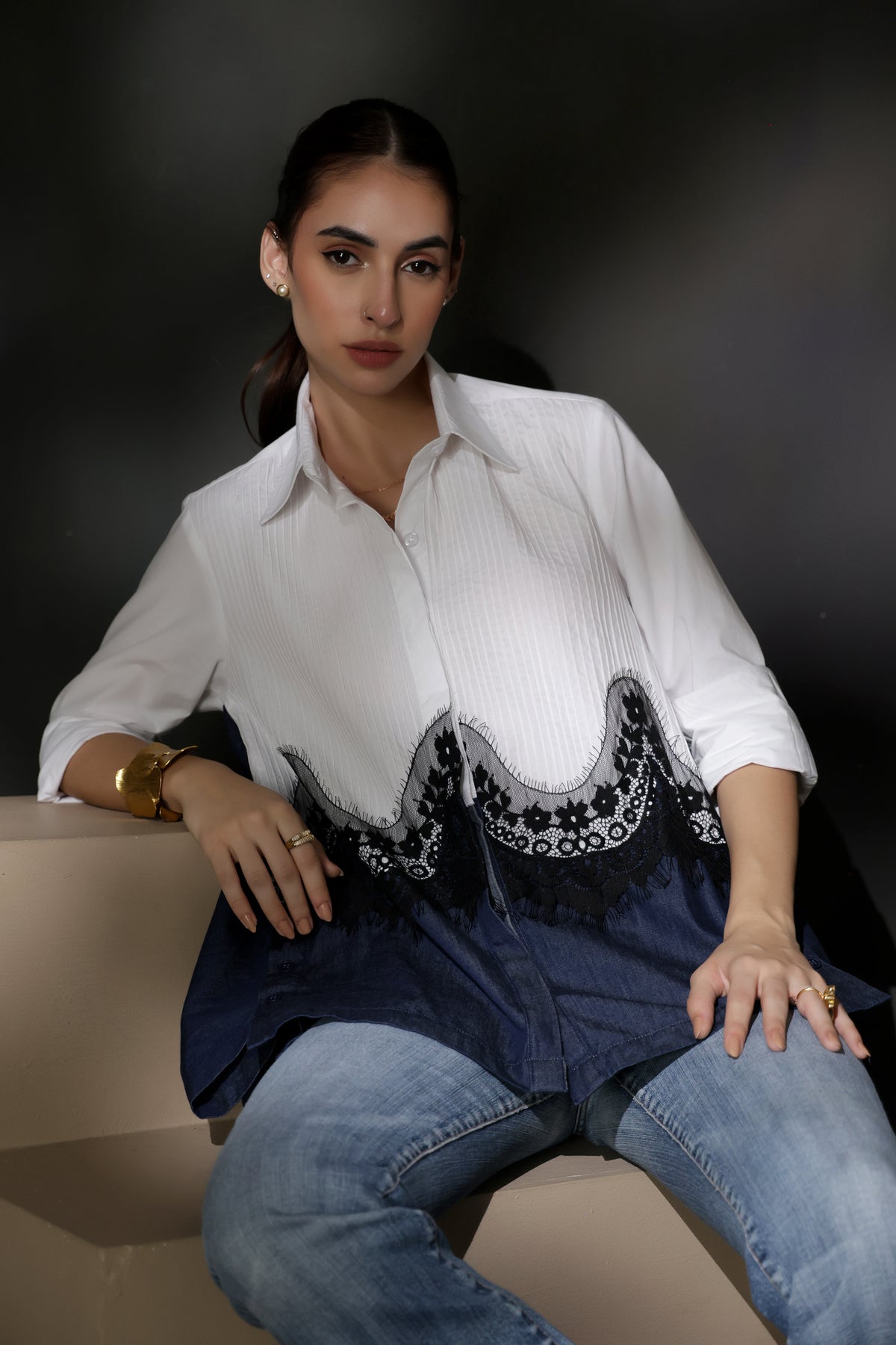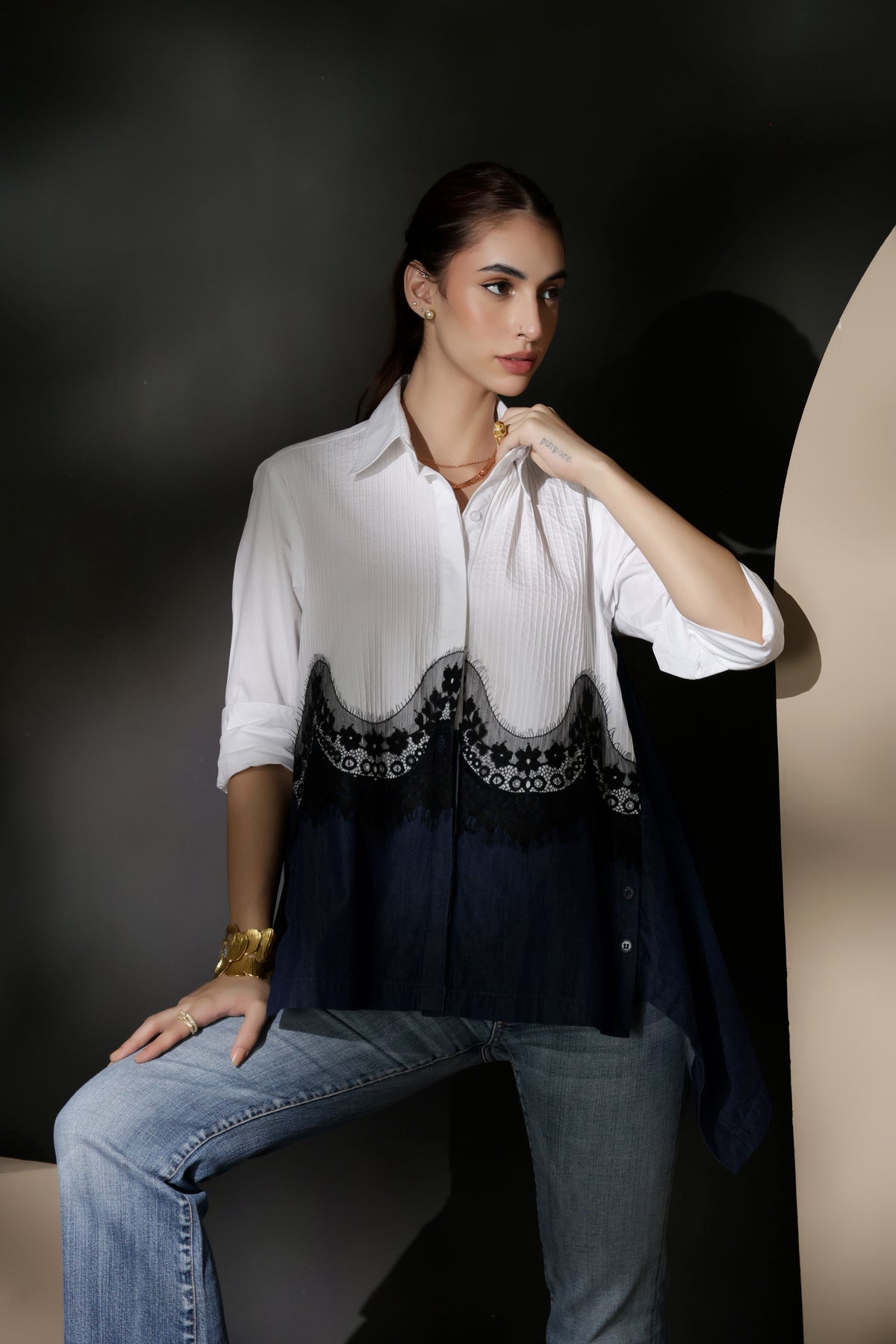 The Ray Shirt is a seamless symphony of design and detail. A crisp cotton top with delicate pintucks flows effortlessly into rich dark denim, while intricate lace defines the middle—creating a shirt that’s modern, feminine, and endlessly versatile. Pintuck detailing at the top for refined texture Denim base with black lace highlights for contrast