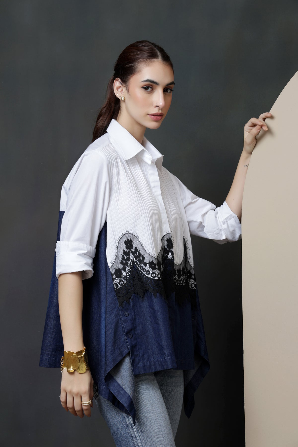 Highlight: The unexpected pairing of crisp cotton, denim, and lace makes Ray the shirt that transitions as easily from day to night as from desk to dinner.