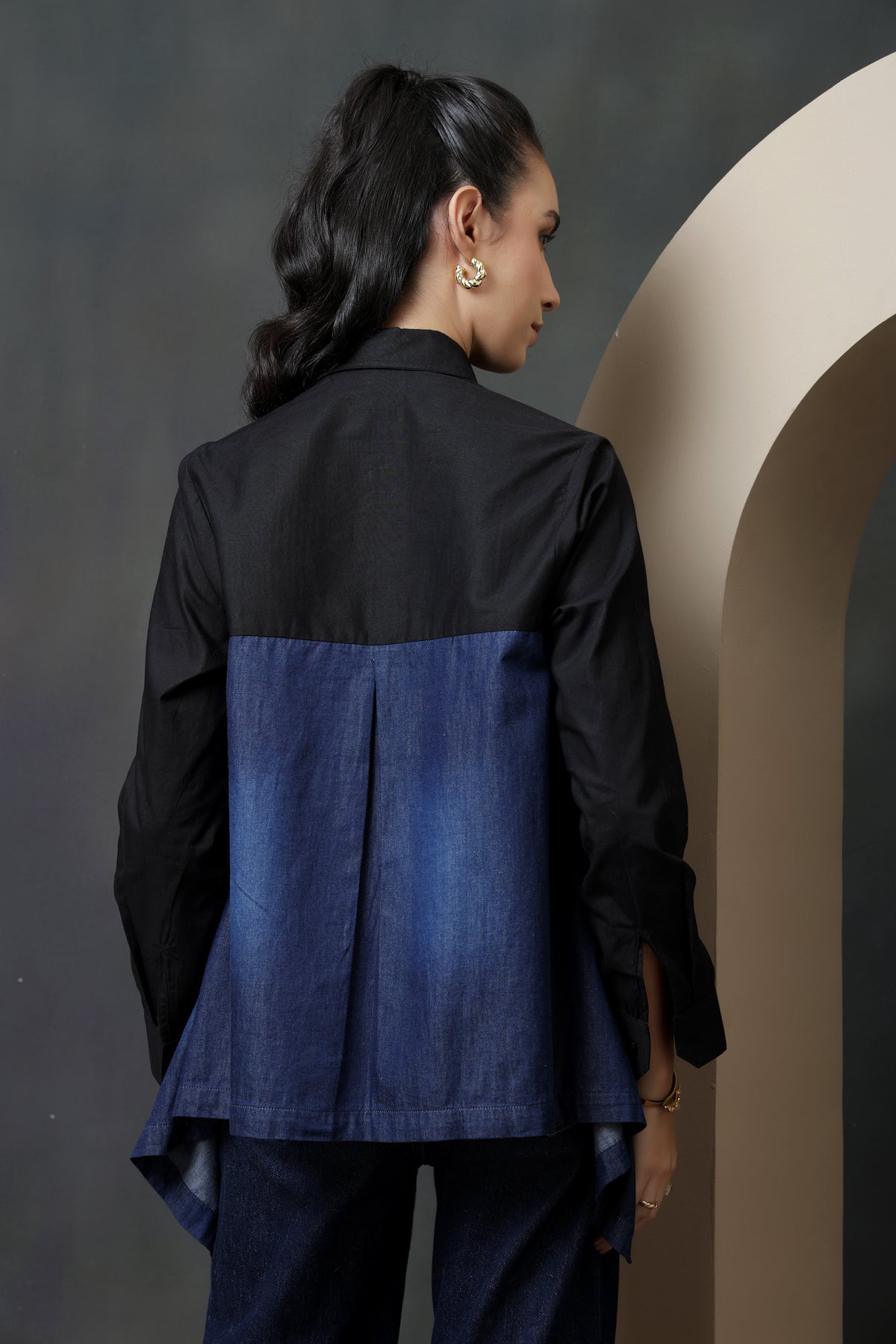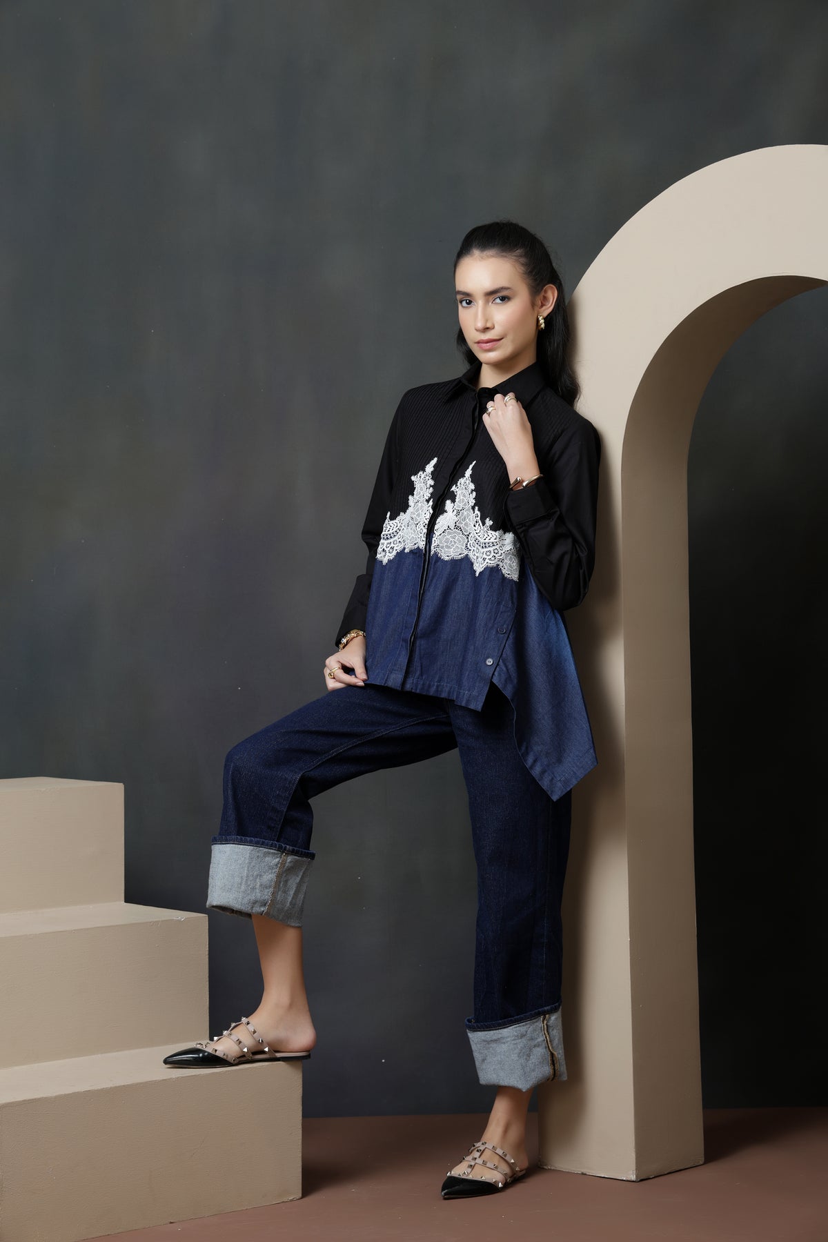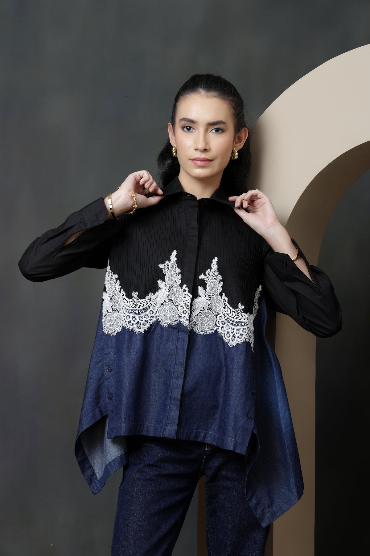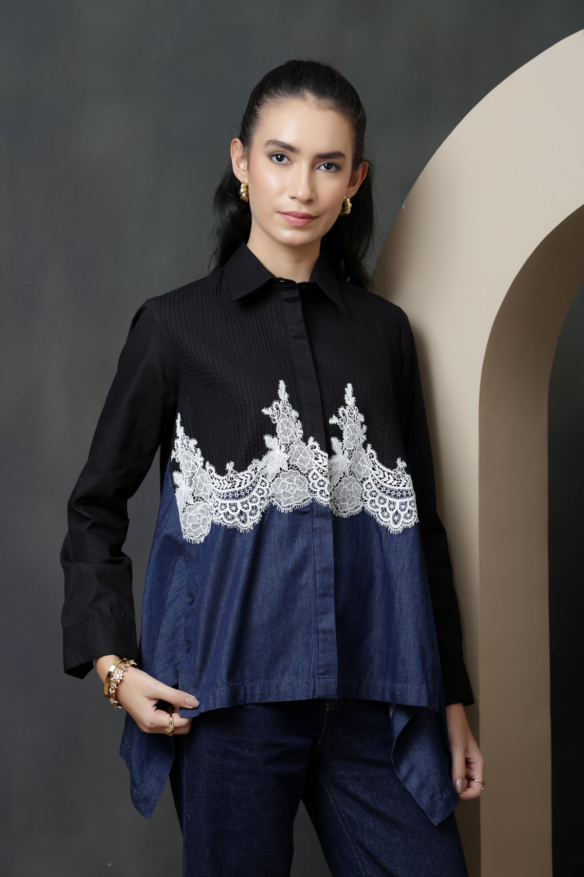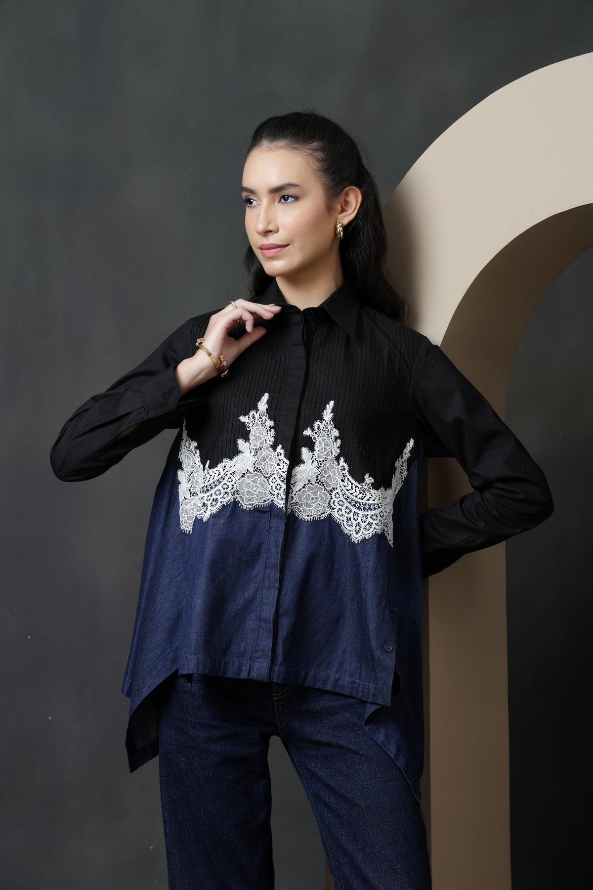 he Riley Shirt redefines elegance with contrast and craft. Crisp cotton with fine pintucks flows into deep denim, while delicate white lace sits between—bringing balance, femininity, and modern edge to this versatile piece.