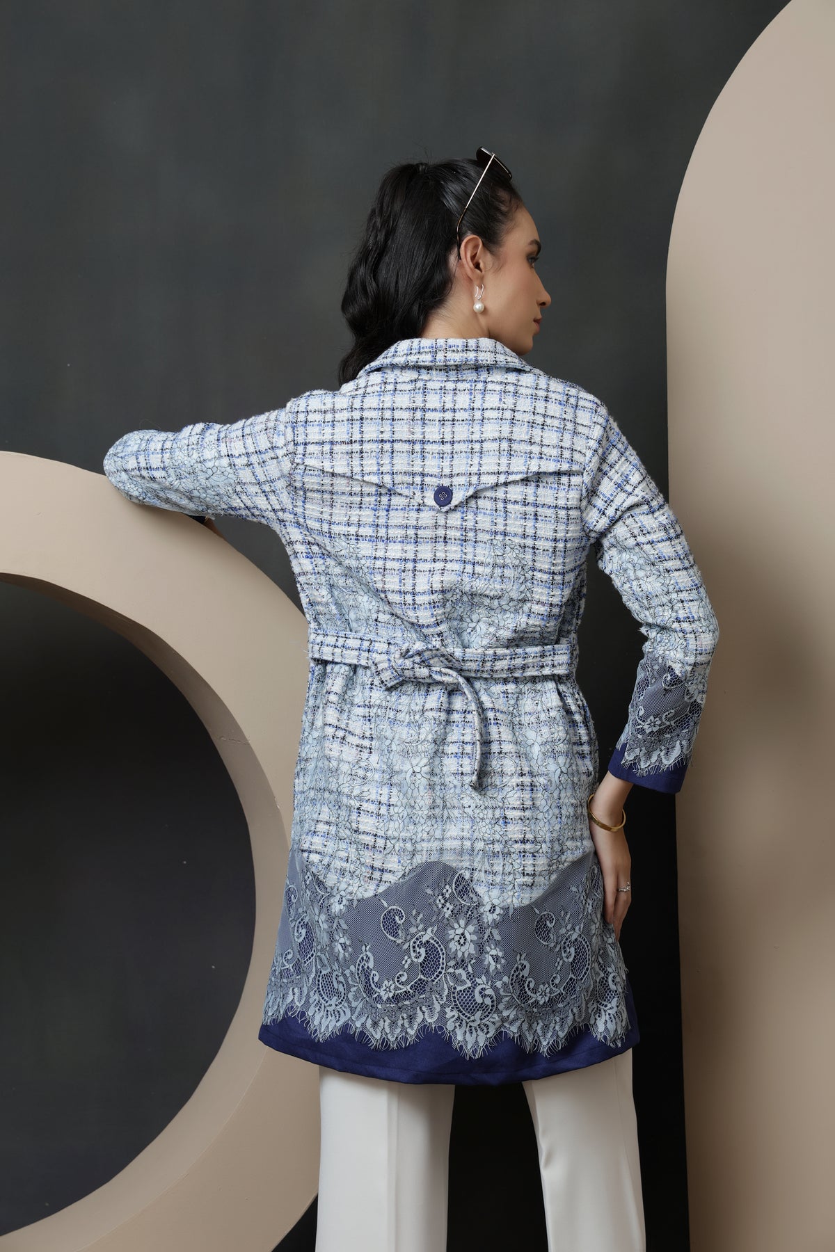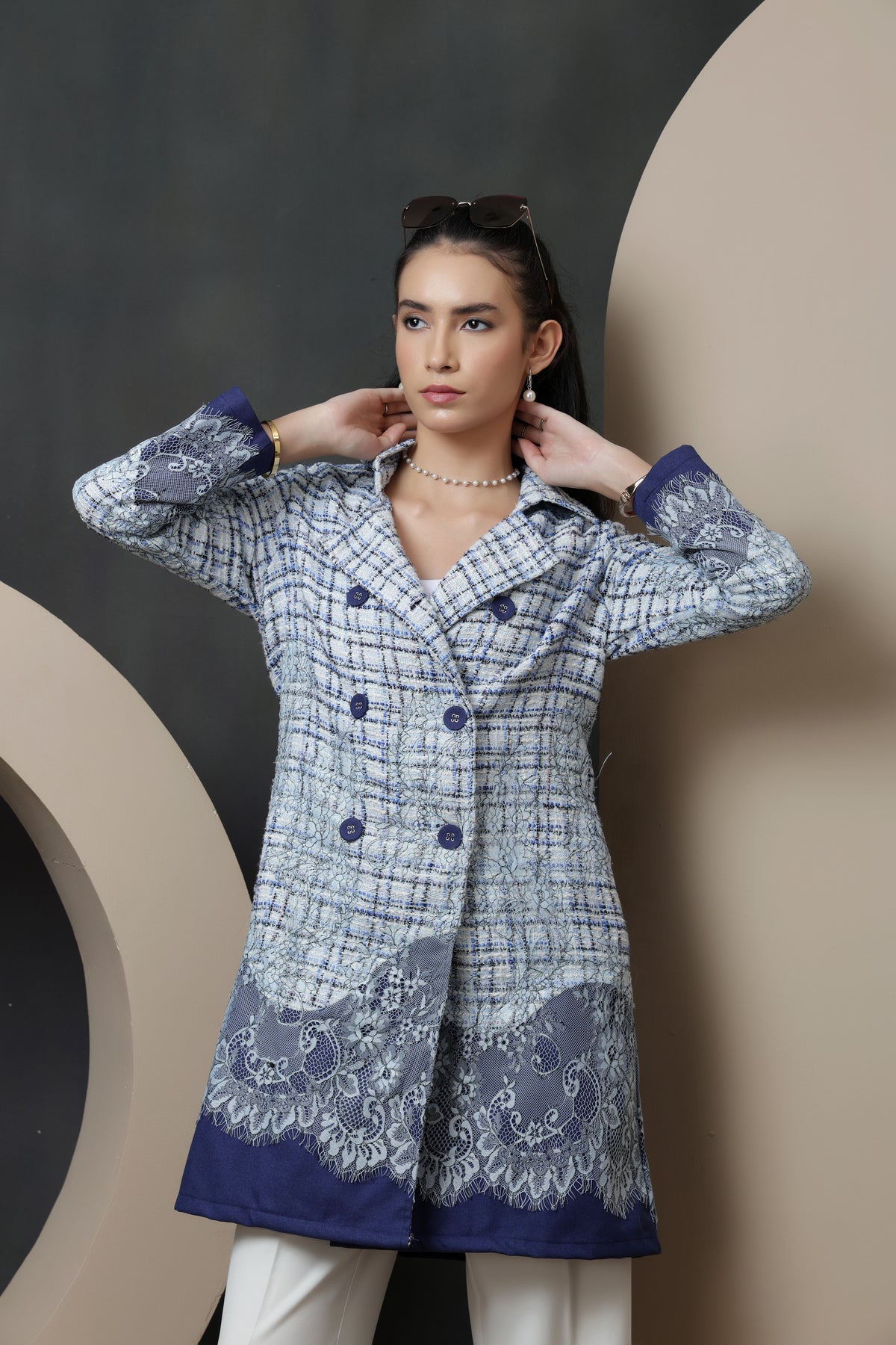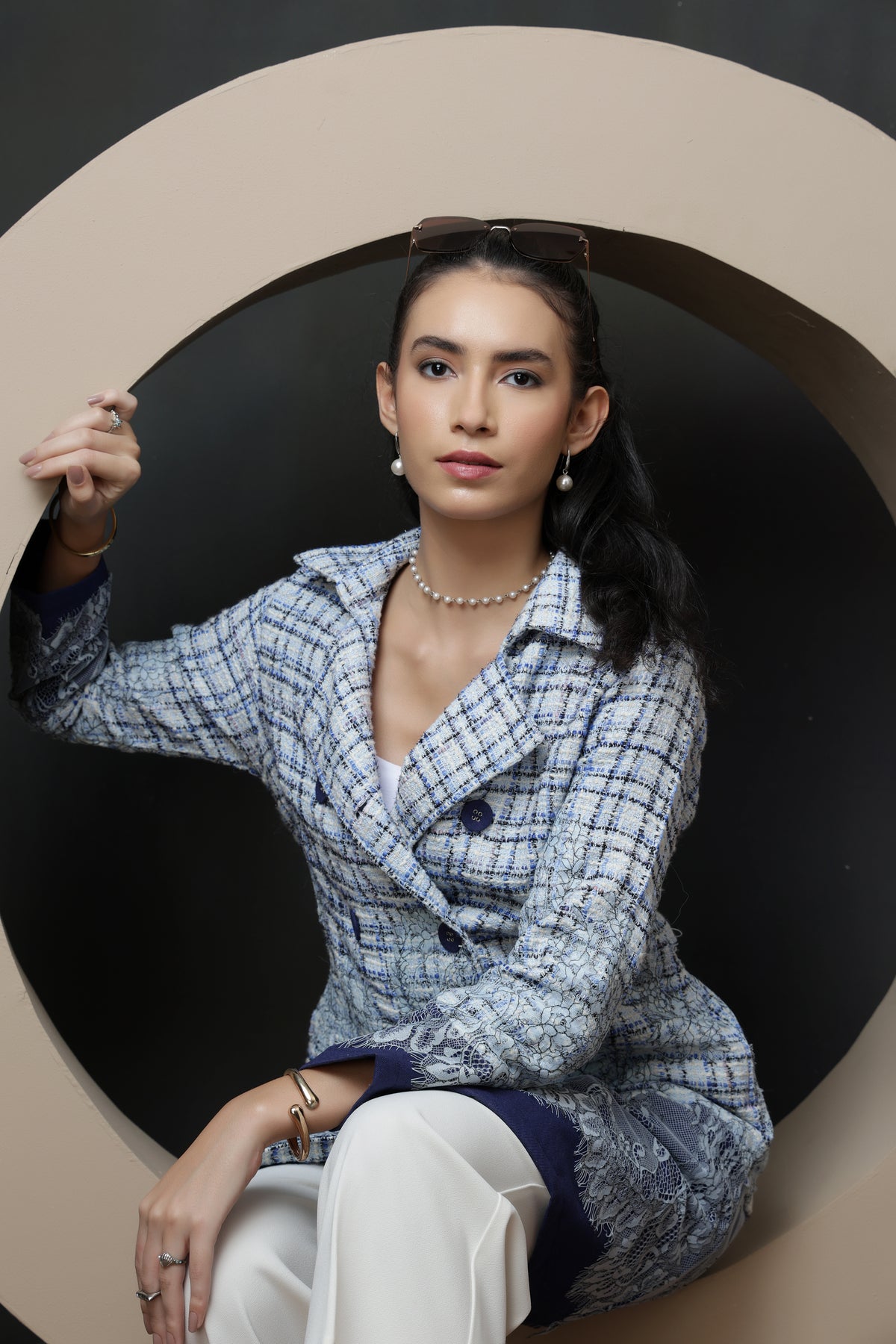 The Azure Long Jacket combines bouclé, lace, and tailored blazer elements for a striking, versatile layer. This knee-length double-breasted jacket blends texture and structure, making it a statement piece for day-to-evening dressing.