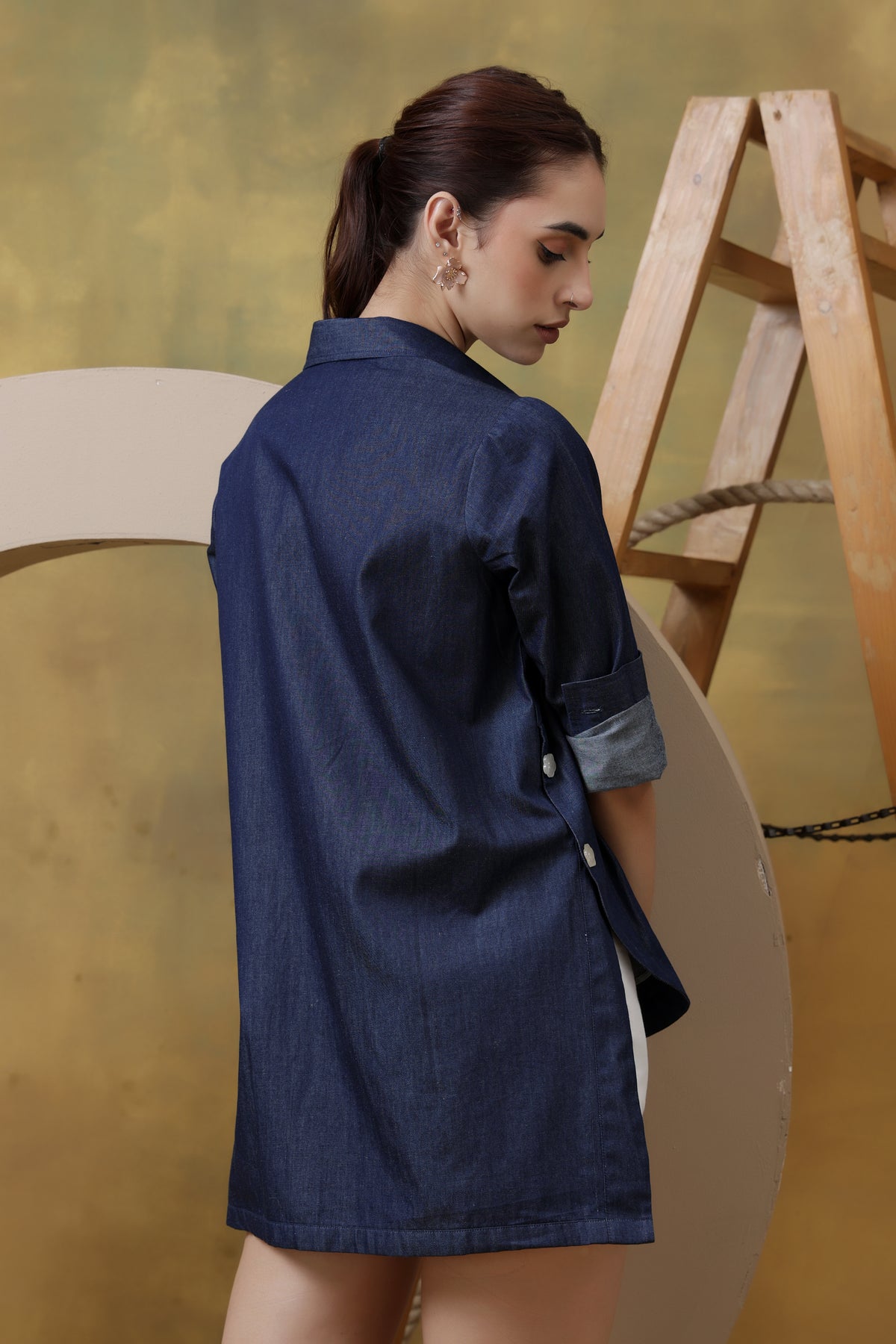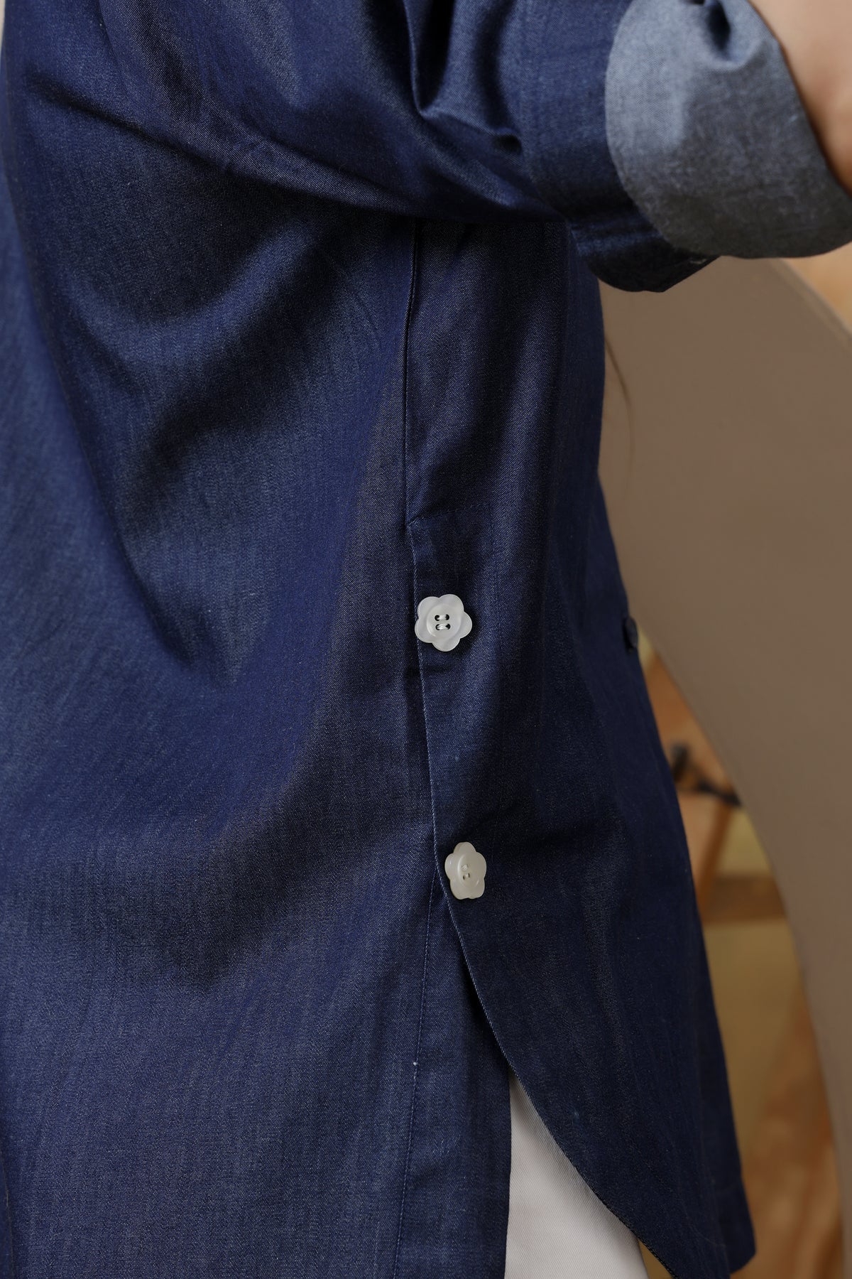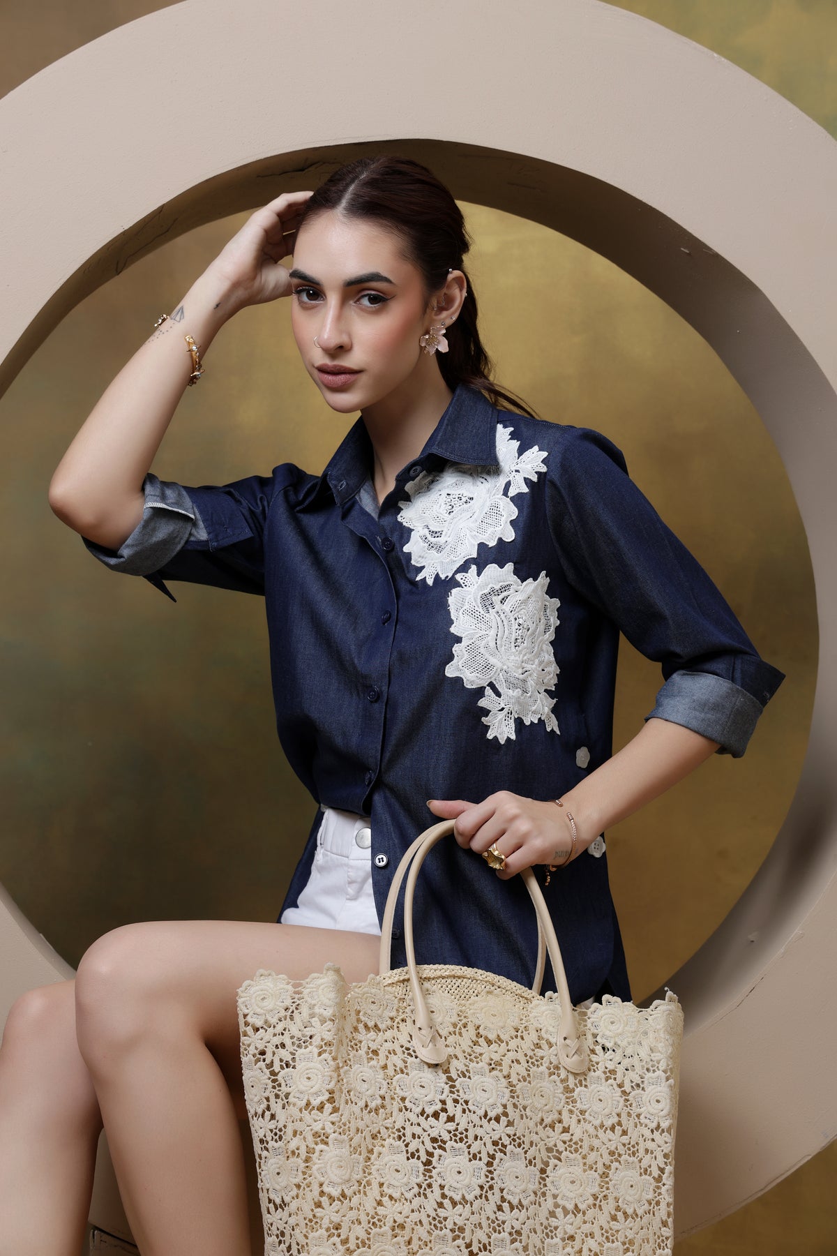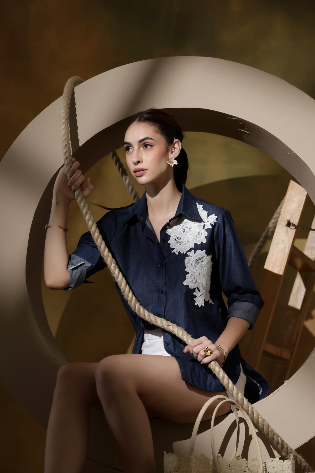 A timeless denim shirt reimagined with a touch of romance. The Jackie Shirt is appliquéd with delicate white lace flowers on the left shoulder, making it an elegant standout piece. Designed with a high–low hemline, floral button details, and long sleeves, this shirt transitions seamlessly from casual to formal.