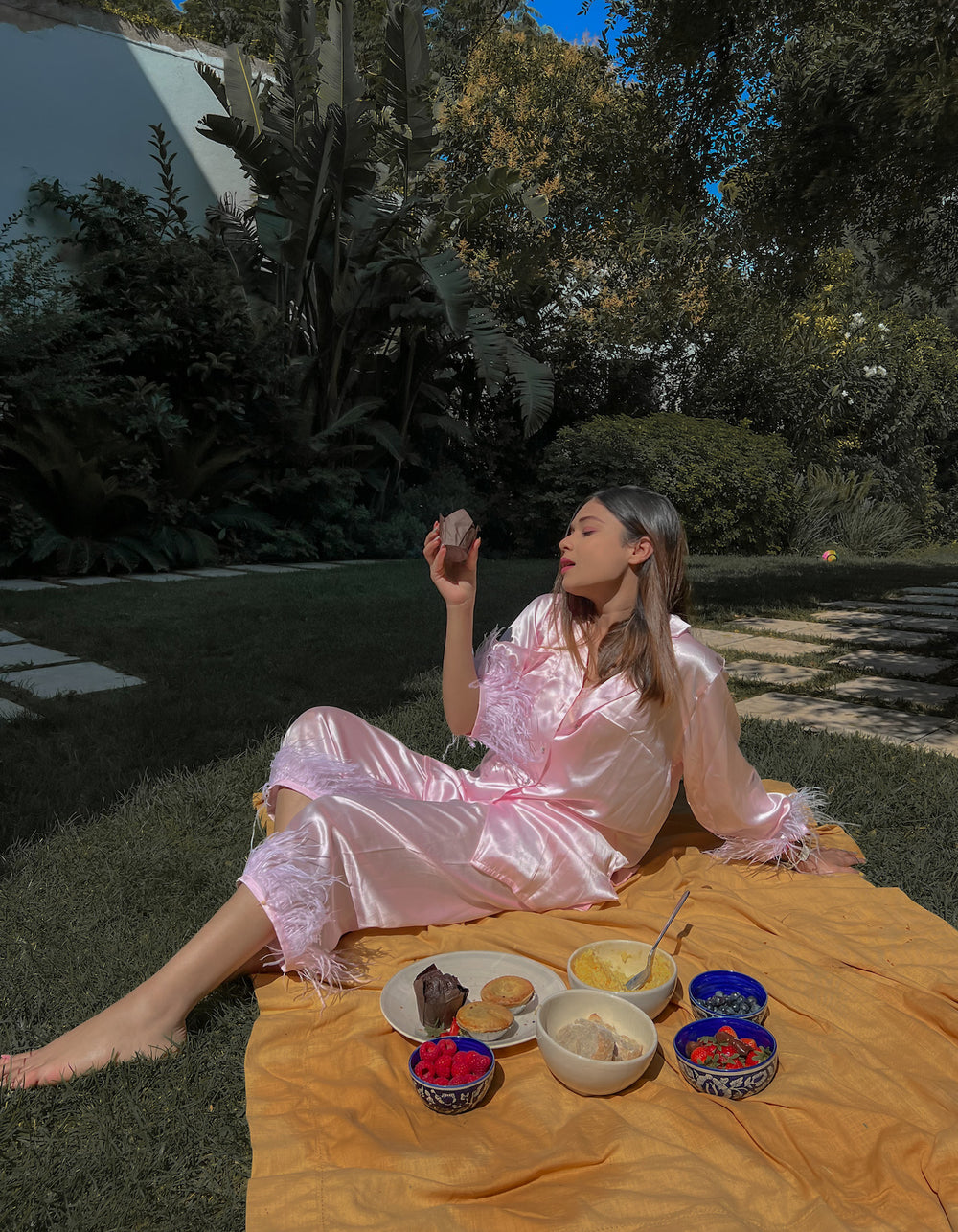 A delightfully chic satin with feathers set crafted in super luxurious satin and embellished with feathers at edges. Relax at home or go out for an evening with friends. This set will always make heads turn!
