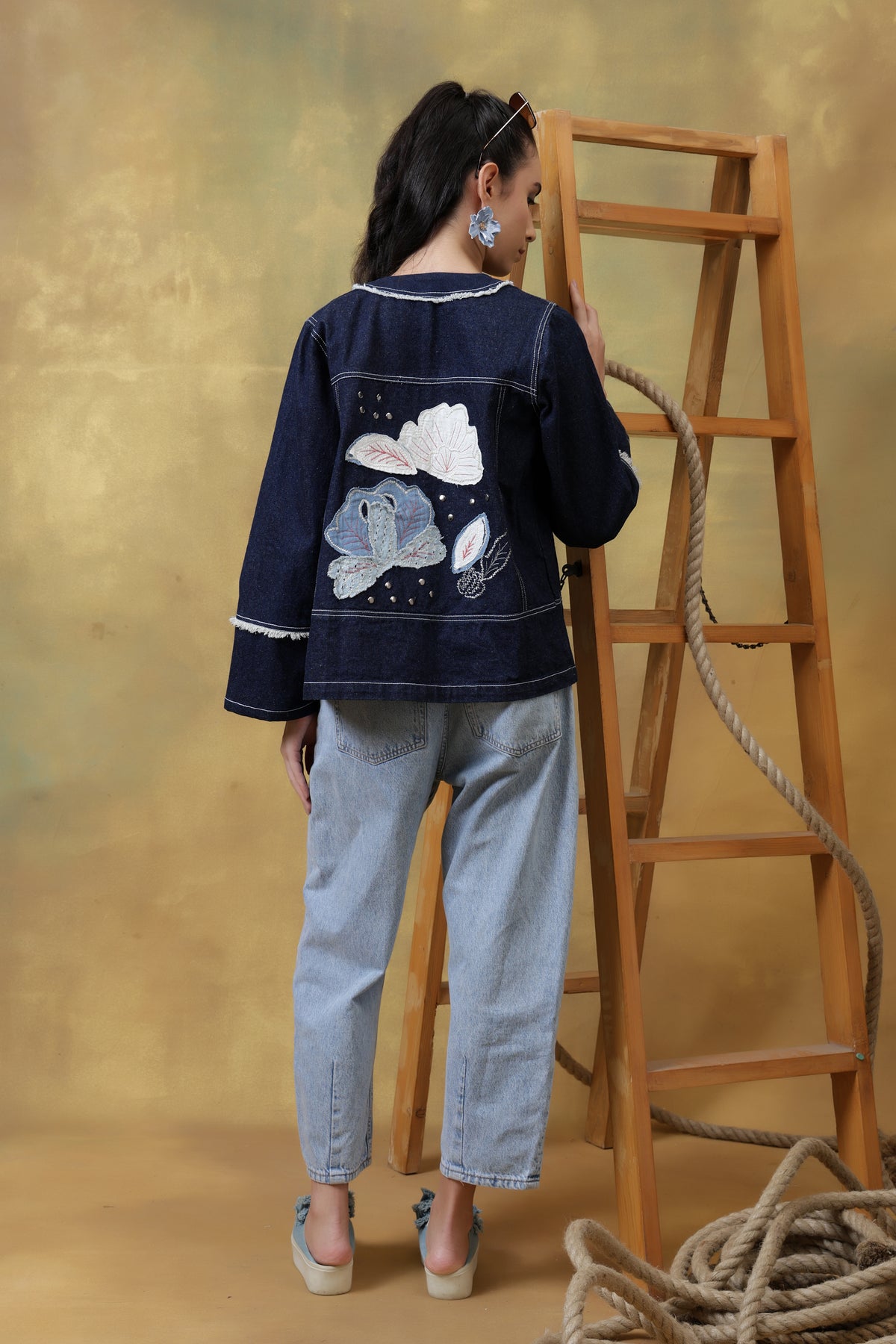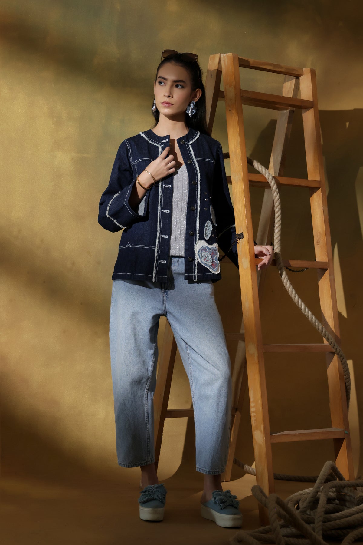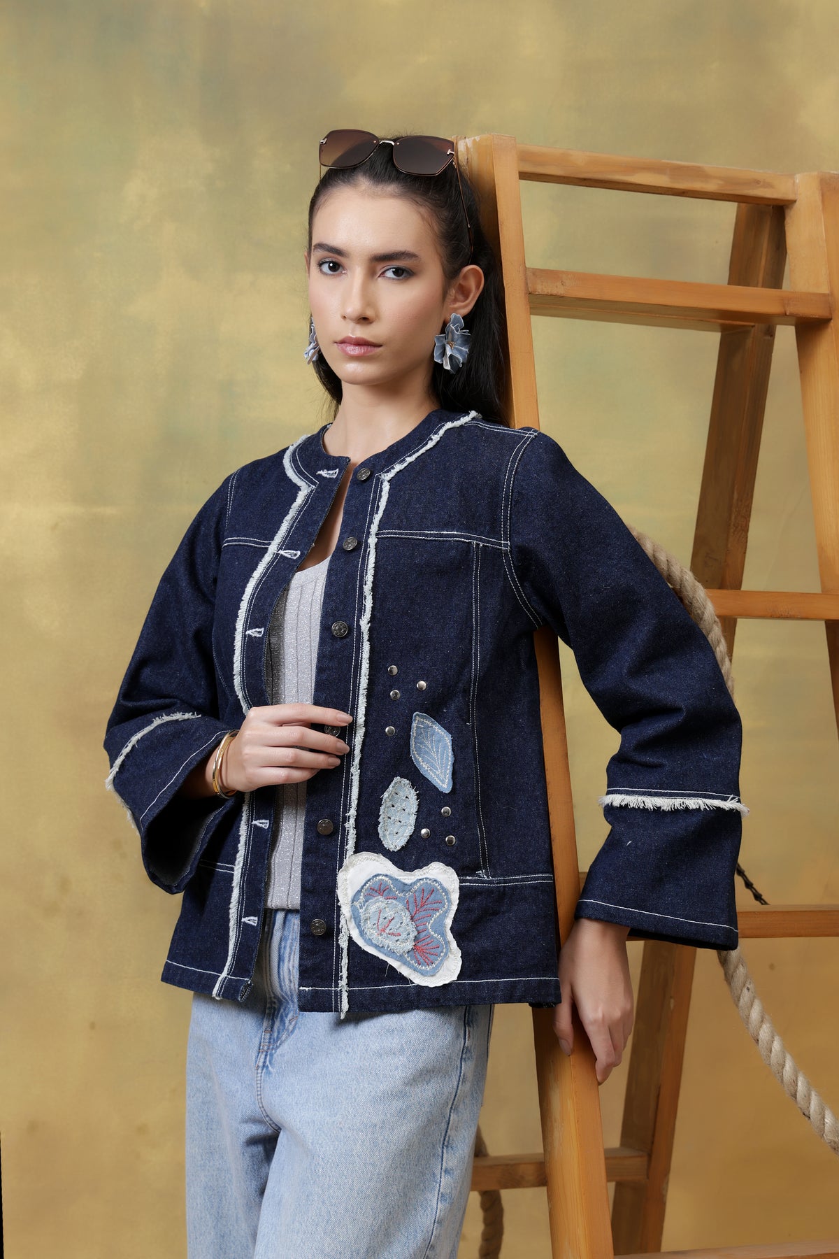 Highlight: The combination of denim appliqué, rivet detailing, and fringed textures transforms Tyler into more than just a shacket—it’s a wearable piece of art.