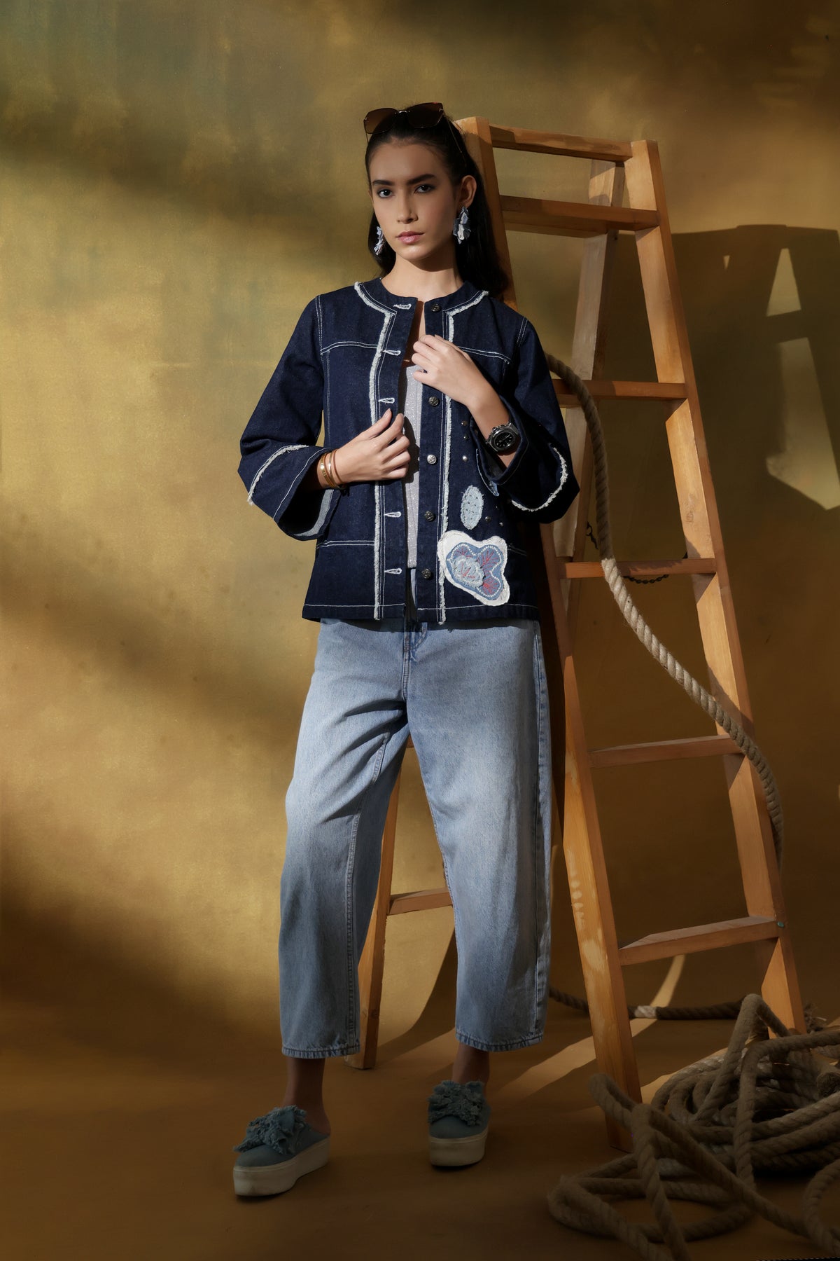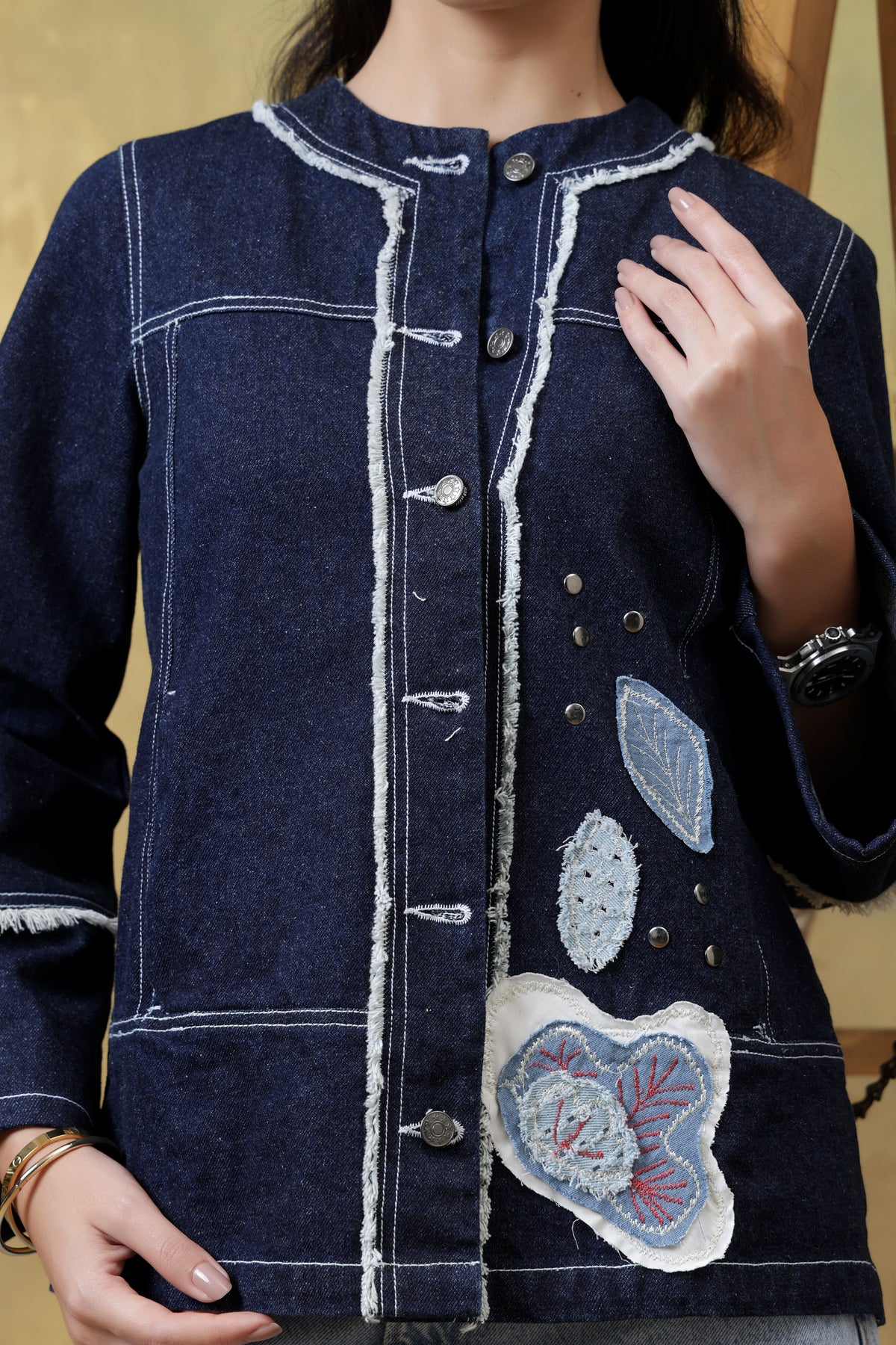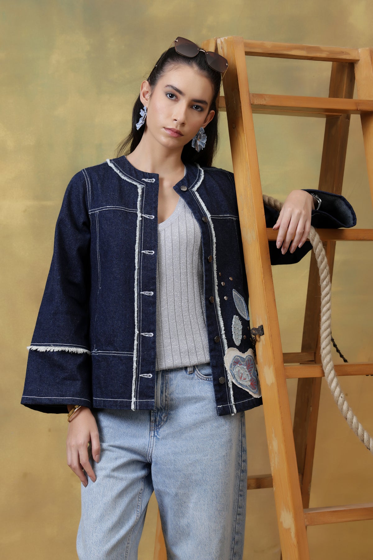 Denim fringe accents on the front and sleeves